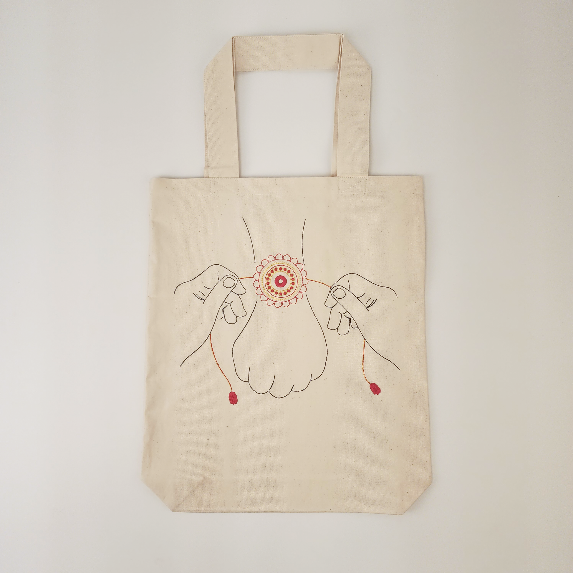 This embroidered Rakhi tote is made for all the gifting, emotional blackmail, and love that comes with tying that thread. Spacious, durable, and full of sibling sass — carry your traditions (and your gifts) in one iconic bag.